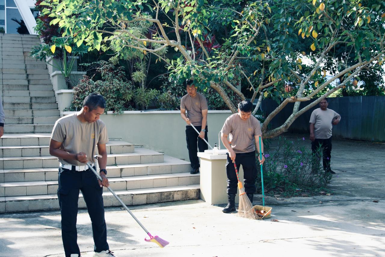 Kutim – Biasanya anggota kepolisian identik dengan seragam dinas dan perlengkapan pengamanan. Namun pagi itu, pemandangan berbeda terlihat di Halaman Gereja Bethani Sangatta, Senin (16/02/2026). Mereka bukan memegang tameng atau perlengkapan taktis, melainkan sapu, alat kebersihan, dan perlengkapan kerja bakti,